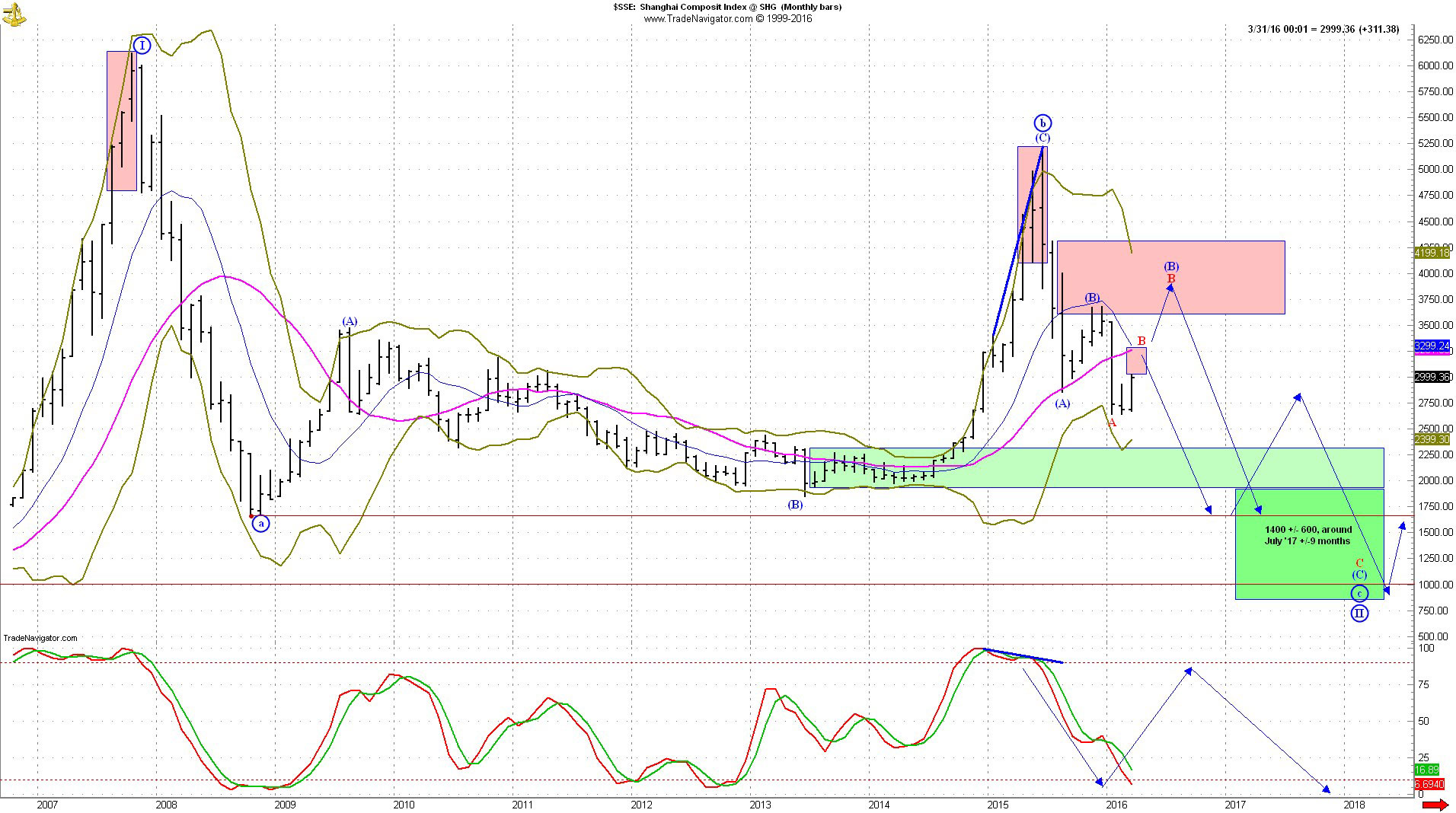 Такого высокого риска для индекса Shanghai Composite не было по крайней мере с декабря. Тогда закончилась четырехмесячная коррекция, за которую индекс с августовских минимумов вырос до 3650, примерно на 25%. Этот рост обозначен волной (B) на приведенном ниже графике. В результате индекс оказался в области покупки, которая обозначена розовым овалом. Это было предсказано в августе, когда цены были на минимальных уровнях, обозначенных зеленым кругом.