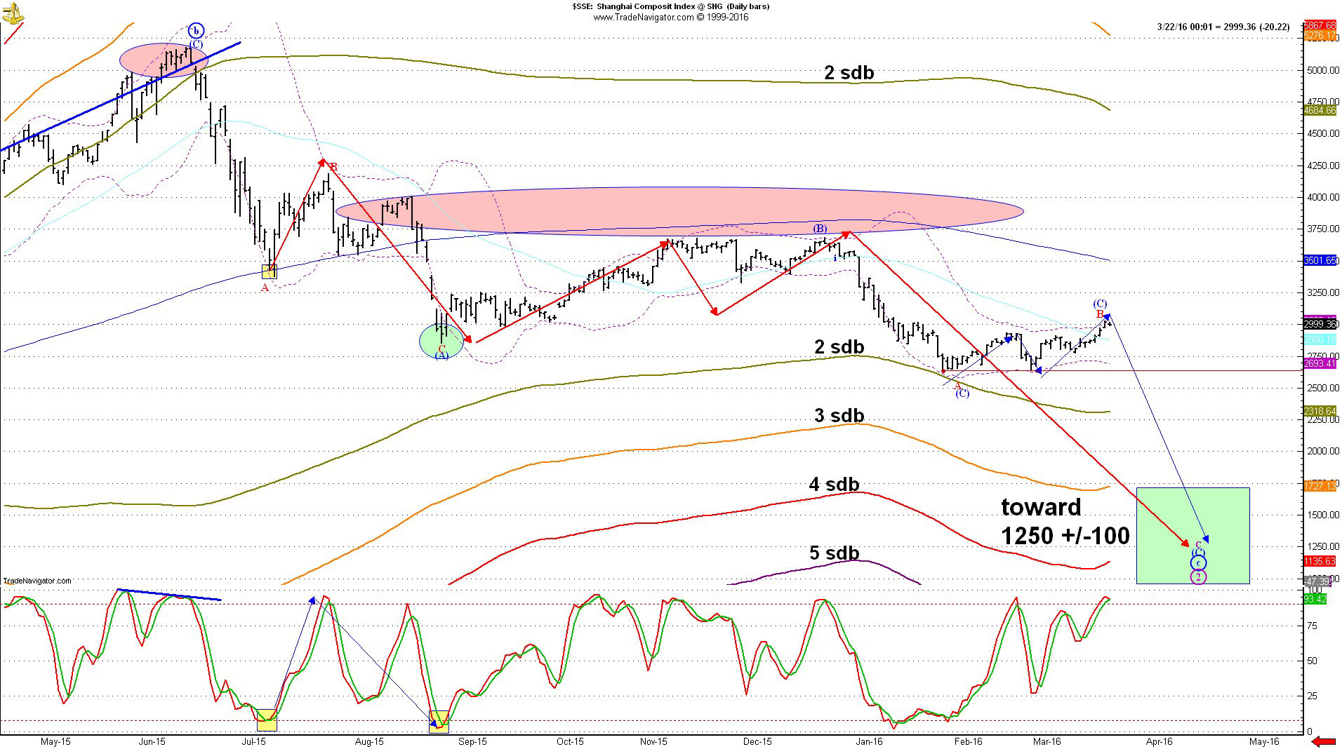 В связи с этим, инвесторам пора выходить из всех длинных позиций на китайском рынке, особенно если они с кредитным плечом или маржой. Дневной стохастик пересек линию вниз, так что поступил сигнал на продажу. Еще один индикатор неизбежного спада – трудности около верхней полосы Боллинджера (фиолетовая пунктирная линия на отметке 3000). Как уже упоминалось, в районе 2000 находится первый целевой уровень поддержки. Но, в зависимости от показаний системы поддержки принятия решений к тому времени, не обязательно последует сигнал на покупку. Не следует сосредотачиваться на какой-либо конкретной цене, необходимо следить за дальнейшим развитием событий.