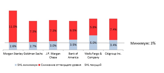 Goldman Sachs и Morgan Stanley набрали минимум по показателю SLR. Это самые низкие уровни среди банков, и в то же время они ниже минимального порогового значения в 3%. Таким образом, в случае кризиса эти банки станут наиболее рискованными. В то же время Goldman Sachs и Morgan Stanley финансовые власти США велели заморозить размер дивидендов.