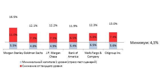 Экстремальные предпосылки модели теста предполагают совокупный убыток финансовой системы составит $578 млрд, тем не менее, несмотря на снижение, все банки показали наличие достаточного количества капитала, чтобы пережить новый возможный кризис. Согласно отчету ФРС банки создали более значительные "подушки безопасности" и смогут удержать сводный коэффициент достаточности основного базового капитала (Tier 1) на уровне 9,2% в рамках пессимистичного сценария против минимального требования регулятора в 4,5%.