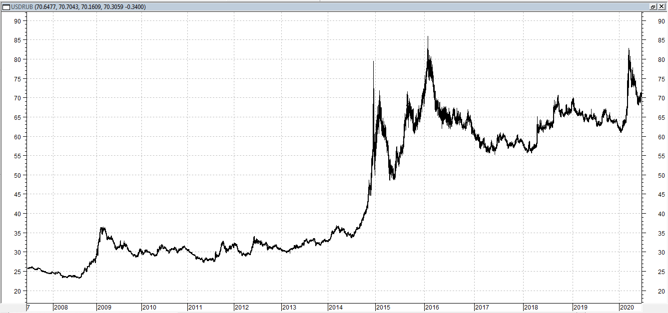 Зависимость рубля от нефти сегодня по-прежнему сохраняется. Однако, влияние на рубль сырьевых котировок, постепенно уменьшается. В том числе, за счет увеличения доли экспорта не сырьевых отраслей – сельхозпродукции, программного обеспечения, продукции ВПК. Если посмотреть на реакцию фондового рынка, то его зависимость также уменьшается. На это указывает динамика индекса Мосбиржи. Падение цен на нефть в 2008 году привела к обвалу индекса Мосбиржи, но в последующие годы такая зависимость явно ослабевает. Поскольку на рынке увеличивается количество акций не сырьевых отраслей.