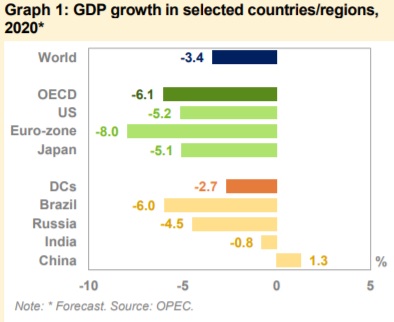 Прогнозируется, что глобальный рост в 1К20 сократится на 3% г/г и во 2К20 ожидается снижение на 10% в годовом исчислении, прежде чем произойдет восстановление во 2П20. По оценкам ОПЕК мировой ВВП в 2020 году снизится на 3,4%. А по ведущим странам величина годового изменения ВВП будет колебаться от -8% в ЕС до +1,3% в Китае.