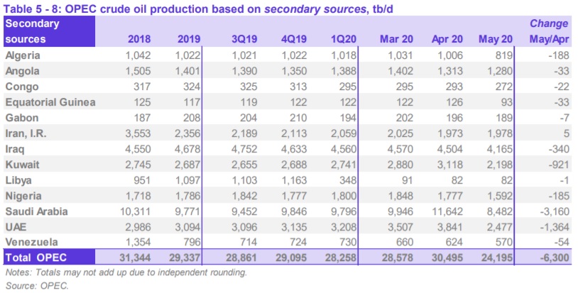 Согласно данным обзора страны картеля в мае месяце сократили добычу на 6,3 Мб/д. Таким образом, картель сократил добычу на 20,66 по сравнению с уровнем апреля.  В сокращении поучаствовали практически все страны картеля. Но более всего постаралась Саудовская Аравия, которая обеспечила половину указанного сокращения. Ее добыча в мае сократилась на 3,16 Мб/д.
