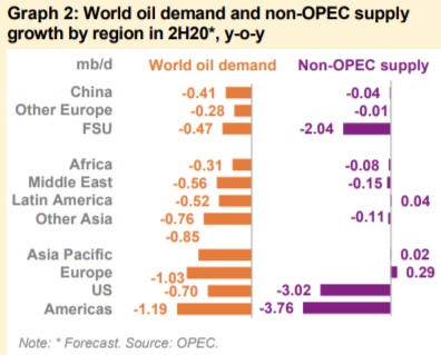 В ОПЕК полагают, что мировой спрос на нефть в 2020 году сократится около 9,1 Мб/д. ОПЕК ожидает во второй половине года снижения мирового спроса на нефть на 6,4 Мб/д по сравнению со снижением на 11,9 Мб/д  в первой половине 2020 года. Прогнозируется, что поставки нефти вне ОПЕК во 2П20 сократятся на 4,3 Мб/д. Оценки изменения спроса на нефть в основных экономиках, а также изменения предложения нефти от стран за рамками ОПЕК можно увидеть на следующем рисунке.
