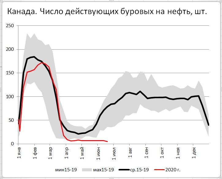 В Канаде буровая активность остается на самом низком уровне. Даже за неделю перестали работать еще две буровые установки. Как видим из графика предыдущих 5 лет, сегодняшнее состояние уже явно выбивается из сезонной картины, когда ранее с началом лета работы на месторождениях заметно оживлялись. В этом году мертвый сезон продолжается существенно дольше обычного. Посмотрим на то, что же будет дальше.