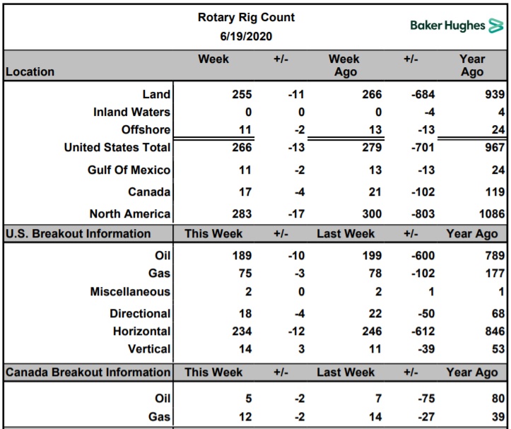 Компания Baker Hughes представила данные по динамике буровой активности по состоянию на 19 июня 2020 года: