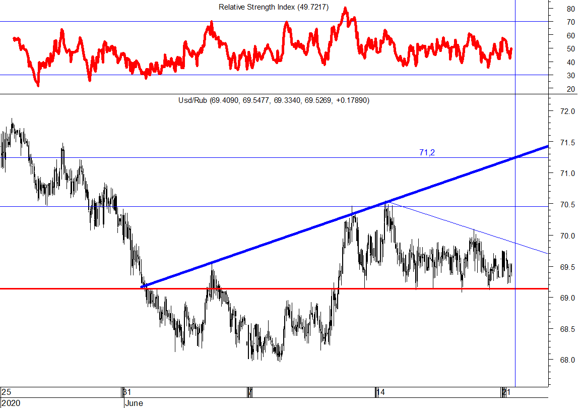 В пятницу Банк России снизил ключевую ставку до 4,5 %. Денежные власти заранее намекнули, что созрели предпосылки для такого снижения, потому что инфляция находится ниже целевого показателя 4%. Решение окажет благоприятное воздействие на рост ипотечного кредитования, поэтому в пятницу среди лидеров роста были отмечены акции компании застройщиков. На курс пары Usd/Rub это событие влияние не оказало. Если подходить к анализу пары Usd/Rub с технической точки зрения, то покупки со спекулятивной целью можно начать после пробития наверх зоны сопротивления 71,2-72. Цель повышения 75. Но, а стратегически, с прицелом на конец года,  можно покупать доллар  уже сейчас. По мере того как экономика будет выходить из временного простоя, давление на рубль возрастет.