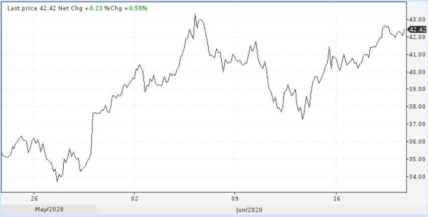 Цены нефти марки Брент за прошлую неделю подросли и на закрытие недели находились чуть выше 42 долларов за баррель, то есть вернулись в окрестность достигнутых на начало июня максимальных отметок.