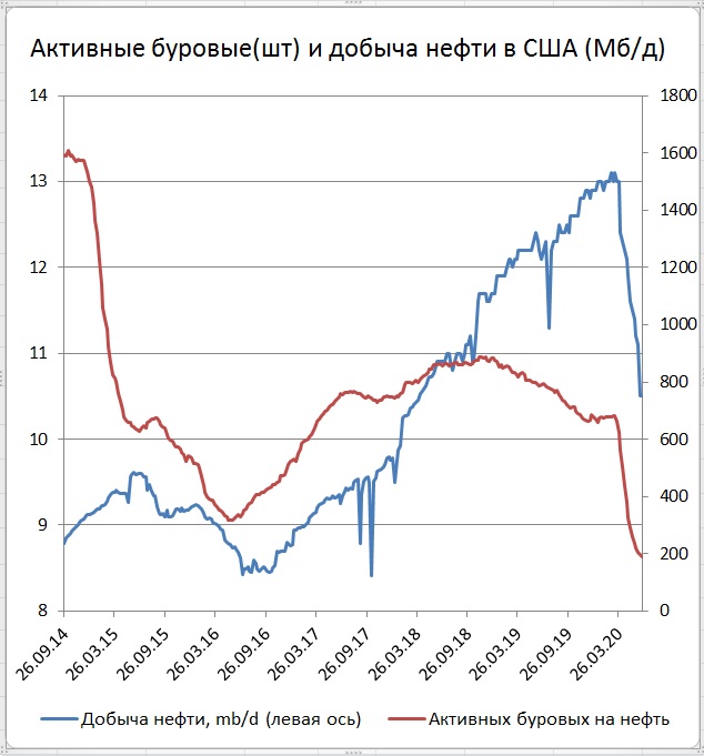 Подбодрили покупателей поступившие на прошлой неделе данные о сильном снижении добычи нефти в США. Количество активных нефтяных буровых в США на прошлой неделе продолжило сокращаться. В результате четырнадцати недель подряд сокращения буровая активность уменьшилась кратно. Резкое снижение буровой активности обещает сдержанность в поступлении из кладовых США новой нефти и уже стало приносить свои плоды в графике добычи. Сокращение добычи со средины марта составило уже 2,6 Мб/д, а на прошлой неделе объем добычи нефти в стране снизился до 10,5 Мб/д., что является минимальным значением с весны 2018 года.