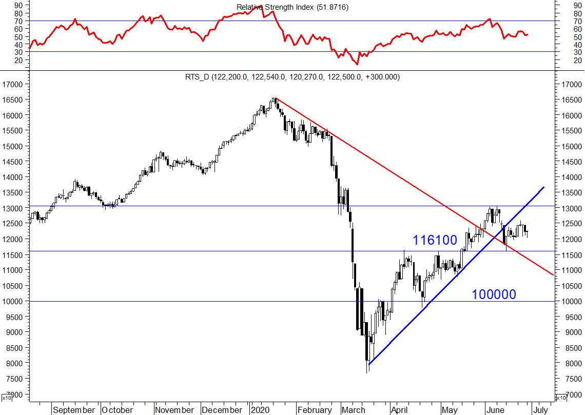 Фьючерс на индекс РТС 10 июня 2020 года пробил вниз мартовский восходящий тренд и перешел в боковой коридор с нижней границей 116100. Не стоит торопиться с открытием коротких позиций по акциям «широким фронтом» до тех пор, пока этот уровень не будет пробит вниз. Нам уже советовали продать акции в мае и уйти, ну а толку то что? За месяц индекс МосБиржи вырос на 1%, а акции Сбербанк об. выросли на 2,5%.