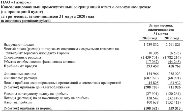 Величина убытка, относящегося к акционерам ПАО «Газпром», составила 116 249 млн руб. за три месяца, закончившихся 31 марта 2020 года, по сравнению с прибылью 535 908 млн руб. за аналогичный период прошлого года.