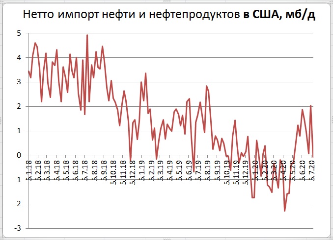 Нетто импорт нефти за неделю снизился на 1,983 Мб/д (снижение произошло в основном за счет сильного снижения импорта при символическом подрастании экспорта). Суммарный нетто импорт нефти и нефтепродуктов за неделю снизился на 2,102 Мб/д  (до -0,075 с 2,027 Мб/д неделей ранее). США после восьми недель состояния нетто импортера вновь сделали заявку на превращение в экспортера.
