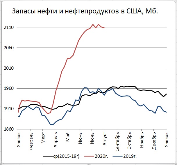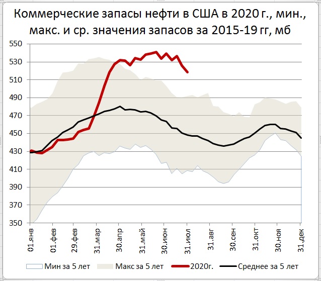 Energy Information Administration (EIA) United States Department of Energy (DOE) сообщило, что за неделю, закончившуюся  31 июля 2020 года, коммерческие запасы нефти в США снизились на 7,4 Мб (до 518,6 с 526,0 Мб  неделей ранее). Как видим, постепенно с 19 июня формируется тренд на снижение запасов. Такое тренд согласуется с обычным сезонным снижением запасов на пике автомобильного сезона.