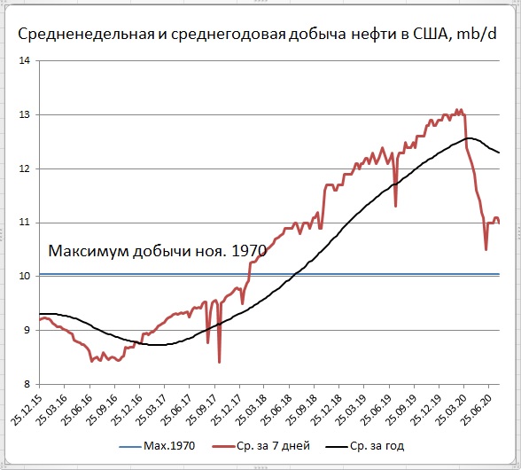 Как обычно, большой интригой стали данные по добыче нефти. На и этот раз за неделю, закончившуюся  31 июля, добыча нефти снизилась на 0,1 Мб/д  до 11,0 Мб/д. Знаковые банкротства добывающих компаний и резкое сжатие буровой активности пока не дают дальнейшего снижения добычи. Откат от максимума добычи двухмесячной давности на сегодня составляет 2,1 Мб/д. Напомним, что за прошедшие 3,5 года добыча нефти в США выросла на 4,5 Мб/д (а за 2019 год прибавила на 1,2 Мб). На текущий момент добыча находится примерно на уровнях двухлетней давности.