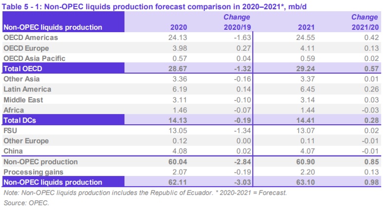 Многие крупные нефтяные компании сообщили о значительных потерях поставок во 2К20 из-за пандемии COVID19. Общее предложение нефти от стран вне ОПЕК во 2К20 упало примерно на 6 Мб/д.  Несмотря на резкое падение добычи нефти во 2К20, особенно в странах ОЭСР и Северной и Южной Америки, ОПЕК пересматривает в сторону увеличения на 0,235 Мб/д оценки производства нефти за пределами картеля. Добыча сырой нефти вне ОПЕК в 3К20 пересматривается в сторону роста. Производство жидкостей вне ОПЕК в 2021 году также пересматривается в сторону увеличения на 0,066 Мб/д и теперь в 2021 году ожидается рост на 0,98 Мб/д, в основном из-за более высоких, чем ожидалось темпов восстановления производства Канады.