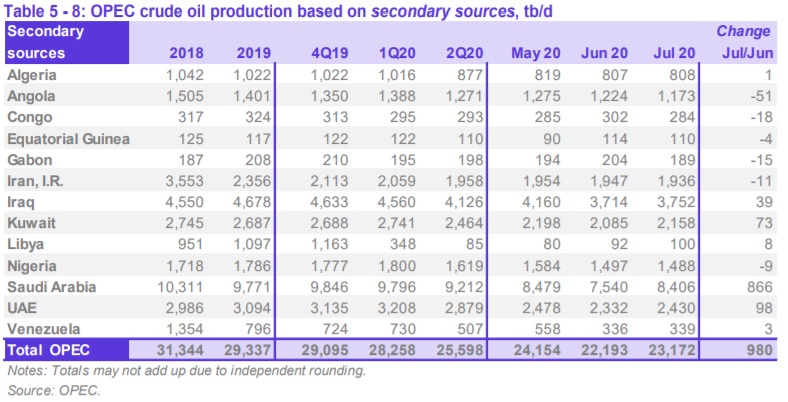 Согласно вторичным источникам, общая добыча нефти ОПЕК-13 в июле составила в среднем 23,172 Мб/д, что на 0,98 Мб/д выше минимальных уровней июня, но пока на 7,222 Мб/д меньше уровней добычи апреля.
