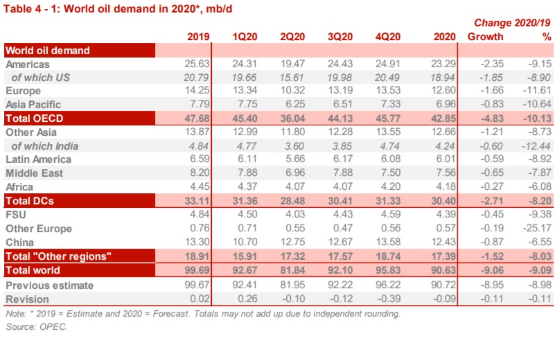 По новым, сниженным на 0,1 Мб/д, оценкам ОПЕК в 2020 году мировой спрос на нефть снизится на 9,1 Мб/д. Снижение прогноза, в основном было связано с более низким уровнем экономической активности в нескольких крупных странах, не входящих в ОЭСР. Правда, пока резкое торможение в странах, не входящих в ОЭСР, во 2К20 было частично уравновешено более высоким, чем ожидалось, спросом в странах ОЭСР. Ожидается, что мировой спрос на нефть во 2П 2020 года достигнет 90,6 Мб/д. А в 2021 году ОПЕК ждет роста мирового потребления нефти на 7,0 Мб/д. В настоящее время общее мировое потребление прогнозируется на уровне 97,6 Мб/д баррелей в сутки в 2021 году. Причем половина этого роста будет обеспечена за счет стран ОЭСР. У стран за пределами ОЭСР лидерам роста, как часто бывает, должен оказаться Китай.