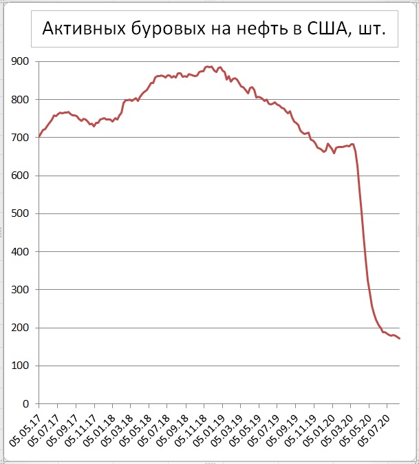 Как видим, в США две последние недели делают заявку на дальнейшее продолжение снижения буровой активности. А всего за последние 5 месяцев число работающих буровых на нефть сократилась почти в 4 раза с 683 штук на средину марта до 172 шт. на 14 августа.