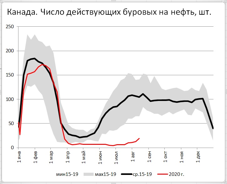 А вот в Канаде продолжается оживление буровой активности. Однако это оживление очень сдержанное и пока кривая 2020 года все еще находится существенно ниже не только средних, но даже и минимальных значений за последние пять лет. Интригой будет оставаться то, до каких максимальных уровней сможет в нынешнем непростом году подняться эта кривая.