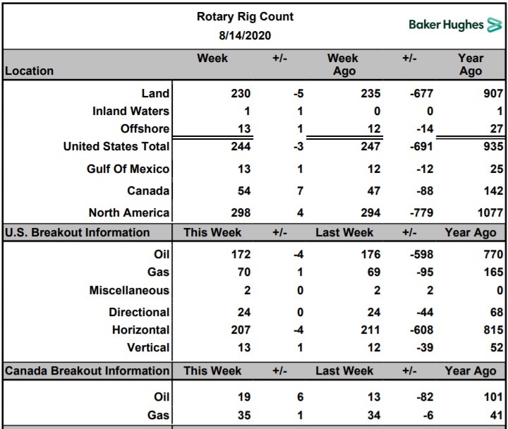 Компания Baker Hughes представила данные по динамике буровой активности по состоянию на 14 августа 2020 года: