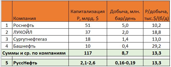 В попытках оценки стоимости РуссНефти по сопоставлениям с соответствующими аналогами лучше ориентироваться именно на наши компании. В результате, если принять, что среднее для российских компаний значение стоимости запасов будет справедливо и для компании РуссНефть, то при ее запасах нефти в 1,6 млрд. баррелей Компания должна стоить 2,6 млрд. долларов. А с учетом запасов газа (около 0,2 млрд. бар. н.э.) стоимость компании должна составить 2,9 млрд. долларов.