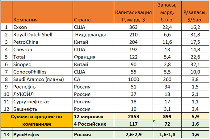 Компания имеет весьма выигрышные позиции по ключевому для нефтяных компаний показателю запасов сырья. Часто нефтяные компании сопоставляют по параметру отношения капитализации к баррелю нефтяных запасов. Такие отношения приведены в таблице ниже для 8 зарубежных и 4 российских компаний.