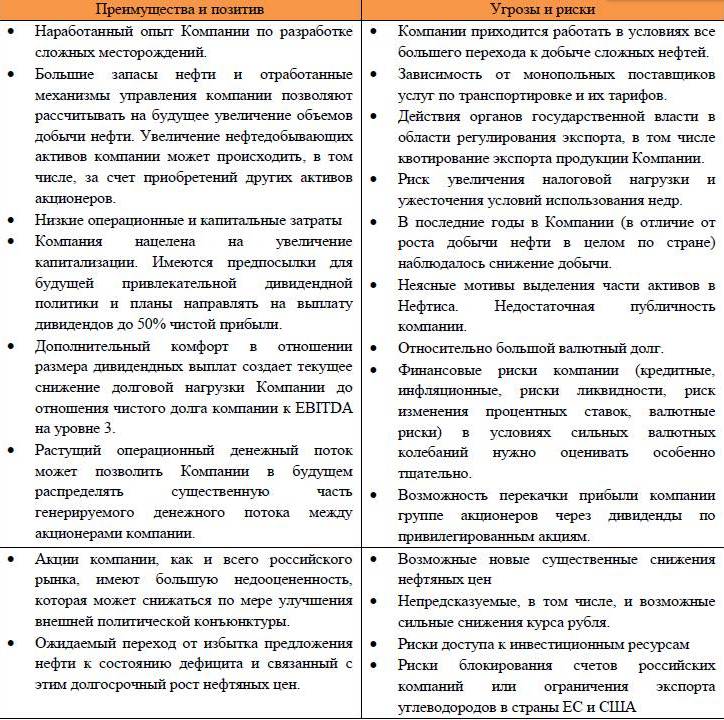 Компания имеет значительные риски для роста стоимости акций. Однако в значительной мере такие риски могут быть компенсированы преимуществами и возможностями компании. Учитывая желание владельцев превратить РуссНефть в публичную компанию и создать ей привлекательный имидж, можно надеяться в будущем на комплекс мероприятий по увеличению ликвидности ее акций и их стоимости. В том числе можно рассчитывать на ряд действий для получения положительной динамики цен до завершения периода 180 дней после проведения IPO, а в будущем на привлекательную дивидендную программу по акциям компании. Можно полагать, что акции компании будут сохранять потенциальную долгосрочную привлекательность для инвесторов, и целесообразны для покупки по сложившимся на бирже ценам.