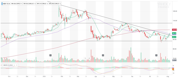 Обоснование: На дневном графике котировки AbbVie протестировали поддержку в районе $88.5, и наметилась повышательная тенденция с ближайшей целью в $106.2.