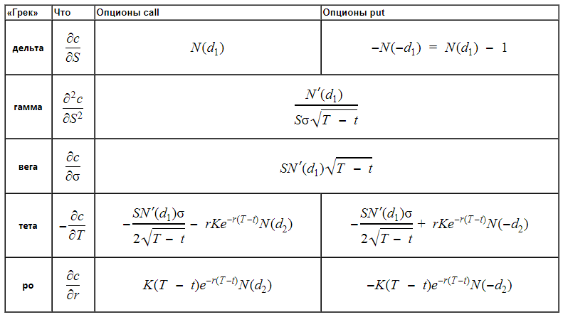 «Греками» в модели Блэка и Шоулза называют коэффициенты, характеризующие чувствительность цены, ее реакцию на изменение различных величин. Коэффициенты обозначаются греческими буквами и рассчитываются:
